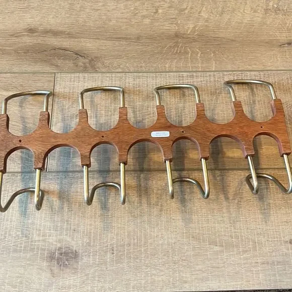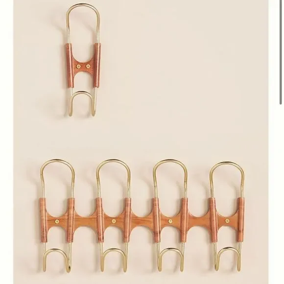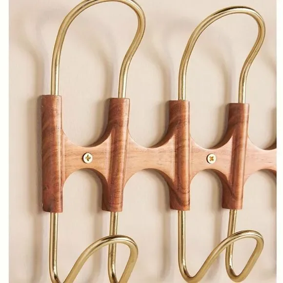 NWB! Fast shipping! Is damaged on one part shown in last photo but the rest is intact and in new condition. Incorporate this golden hook to any entryway or bedroom for multiple hanging of coats and jackets.Exclusive to AnthropologieHardware requiredCast iron, Acacia woodWipe with damp clothImportedDimensions22cm H, 41cm W7cm projectionHolds 2kg