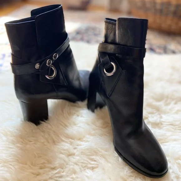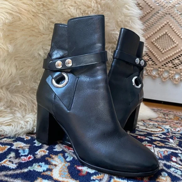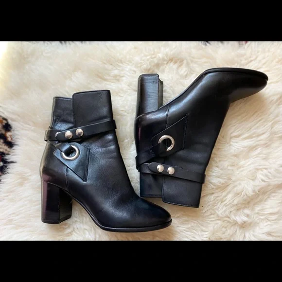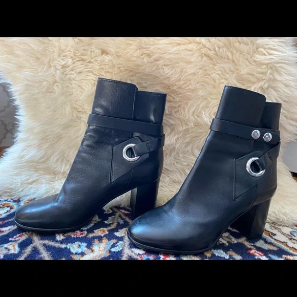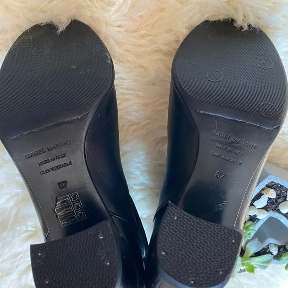 Ashes black leather ankle boots from Isabelle Marant with a strap that wraps around the ankle.Leather in excellent preowned condition.Isabel Marant "Ashes" Ankle Boot classic leather 'Ashes' boot is crafted in Italy with a flattering crossover strap which snaps. Made of leather in a very dark navy blue shade called "Midnight".