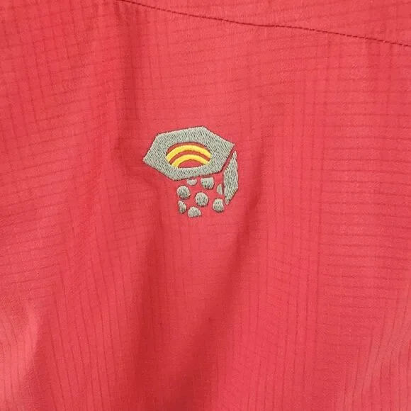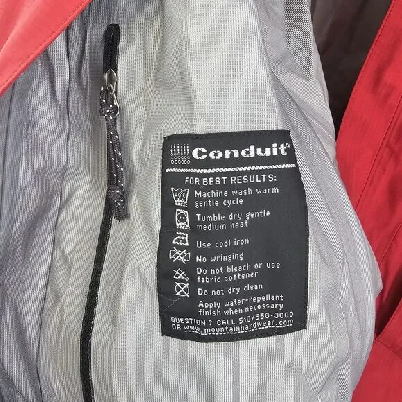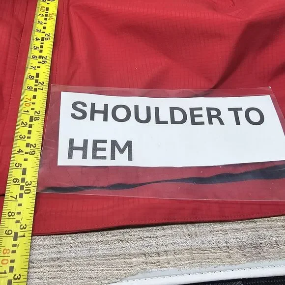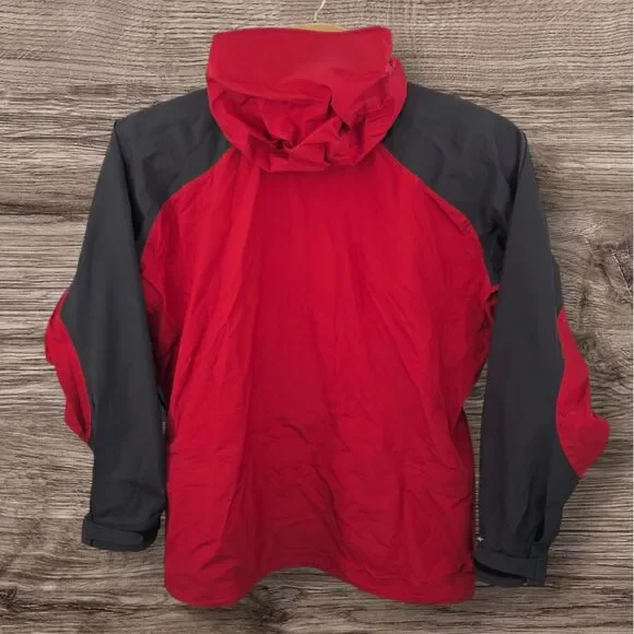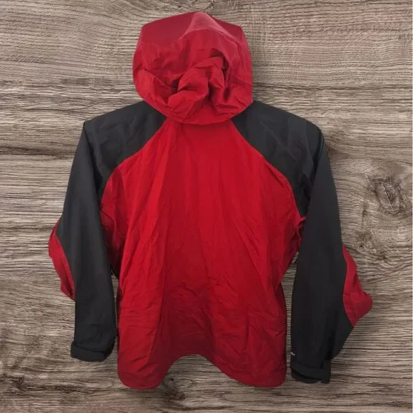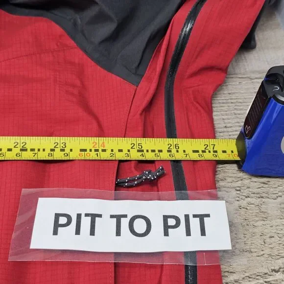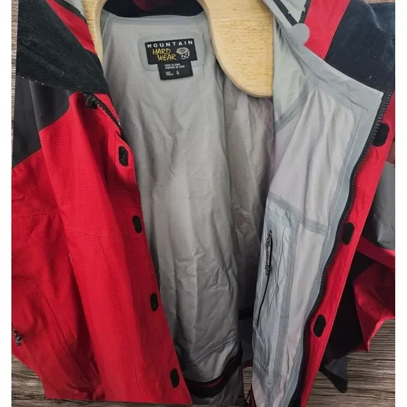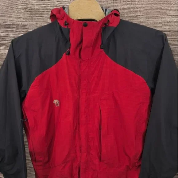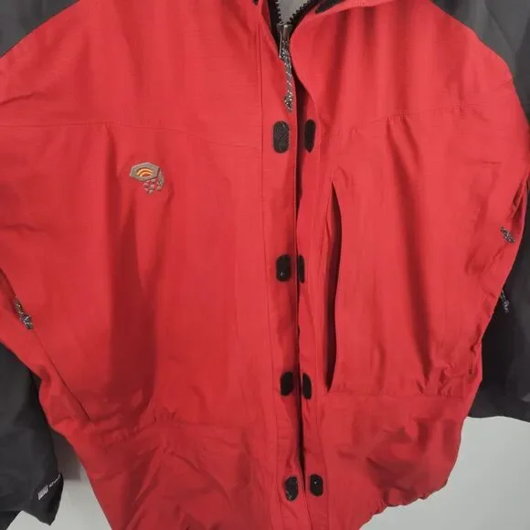 Good Preowned condition no holes see photos. Men's Size XL from Mountain Hardwear. Red and Black Hooded Full Zip Front with many zippered inner/outer pockets. Elastic waistband with adjustable sleeve cuffs. The jacket is Waterproof and will keep you dry.Pit to Pit measures 27 inches acrossLength measures 31 inchesOne day handling time