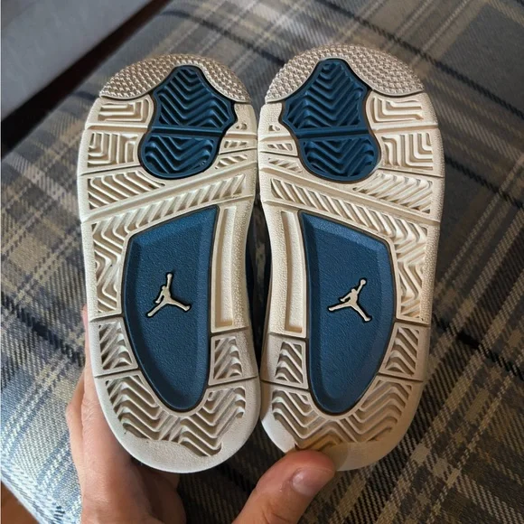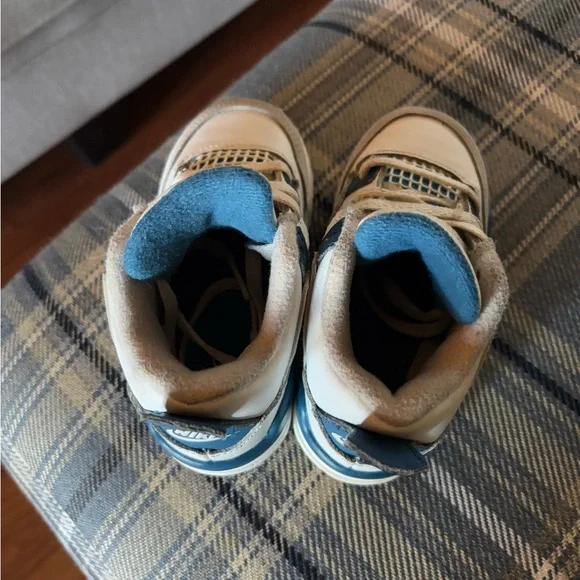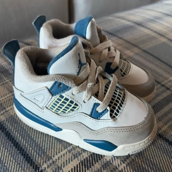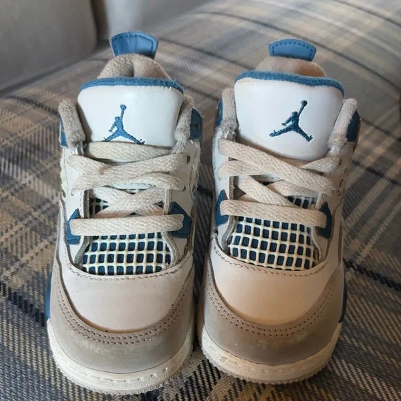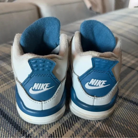 **Product Description**:Introduce your little one to iconic style with the Nike Jordan Retro 4 "Military Blue" sneakers in size 7C. Featuring a crisp white leather upper with bold blue accents, these shoes deliver timeless Jordan heritage. Designed for comfort and durability, they include a padded collar, cushioned insole, and a sturdy rubber outsole to keep up with active toddlers. The signature mesh detailing and Jumpman logo add a classic touch to these sought-after kicks. Perfect for playtime or casual outings, these sneakers offer unbeatable style and support for little feet.Nice pre-owned condition with some normal wear ---**SEO Word List**:- Nike Jordan Retro 4- Military Blue toddler shoes- Size 7C Jordans- Toddler Nike sneakers- Retro 4 Military Blue- Iconic Jordan toddler shoes- White and blue Jordan sneakers- Durable toddler athletic shoes- Jumpman toddler sneakers- Comfortable toddler Jordans