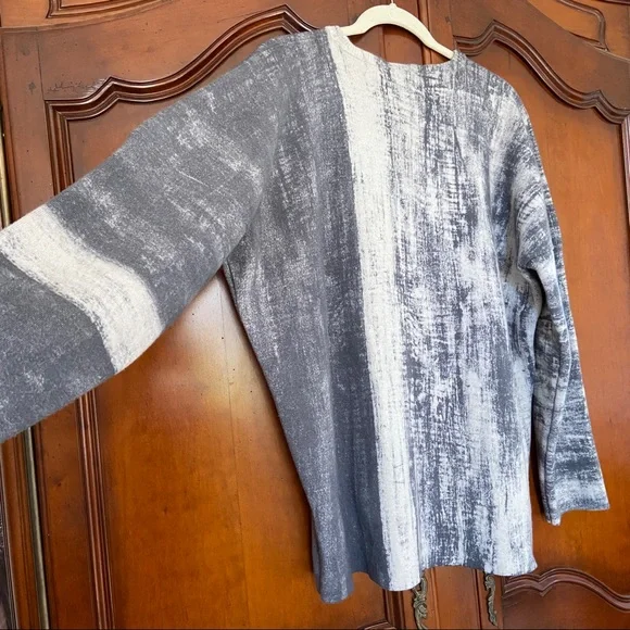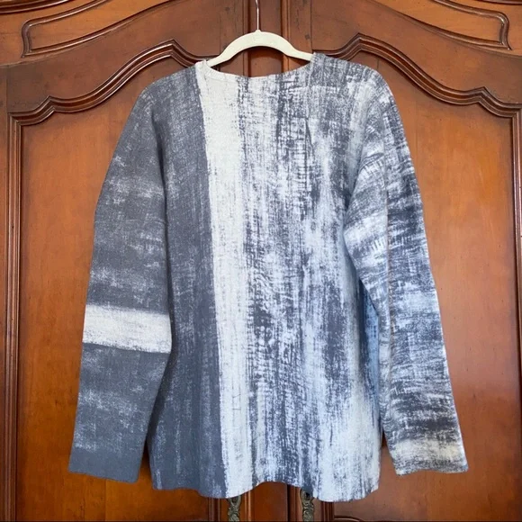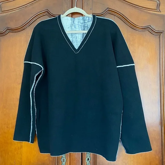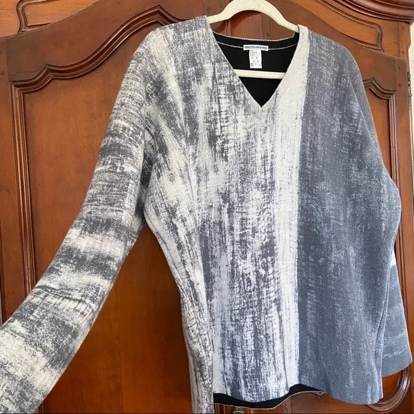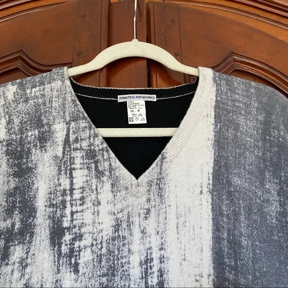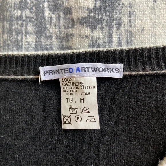 Printed Artworks 100% Cashmere V Neck Boxy Oversized Brush Stroke Abstract SweaterDouble FacedReversibleV NeckBoxyOversizedArt to WearMade in ItalyThick, tightly woven 100% CashmereFully fashioned seamsThis sweater is double faced and reversible if you remove the brand tag! The seams are fully fashioned and so are neat enough to make it look intentional. The inside of the sweater is solid black with contrasting white stitching at seams. MeasurementsDrop shoulderBust (underarm to underarm) 26”Waist 23”Length (top of shoulder to bottom hem) 28”Sleeve (top of shoulder to cuff) 23” if top of shoulder is taken directly above underarm, as the dropped shoulder seam would give a misleading sleeve lengthAll measurements taken flat. Please double bust/waist/hip for full circumference.
