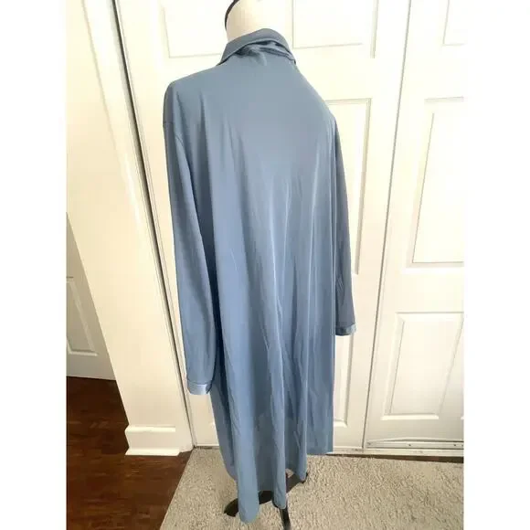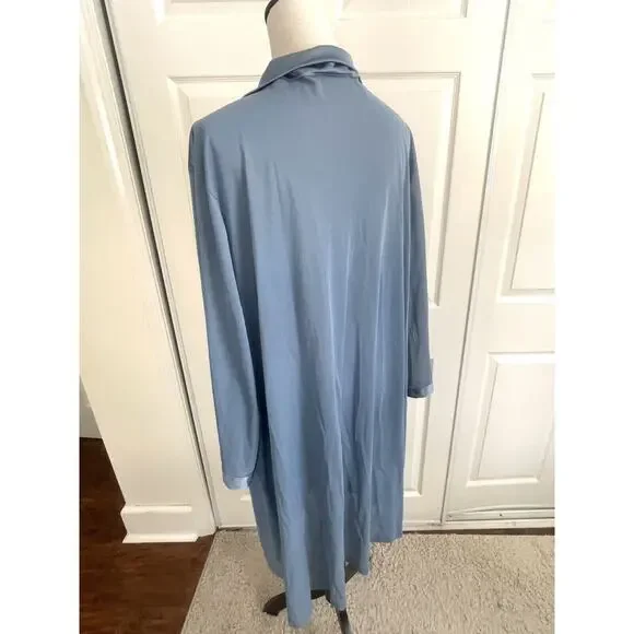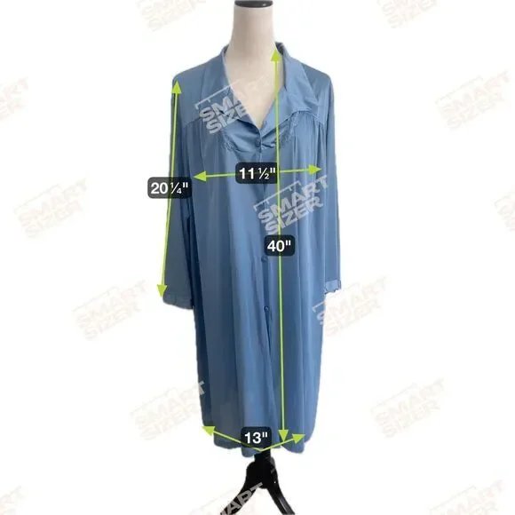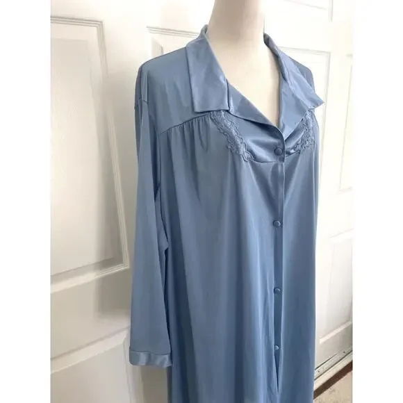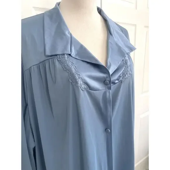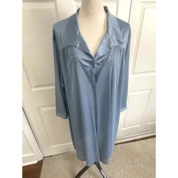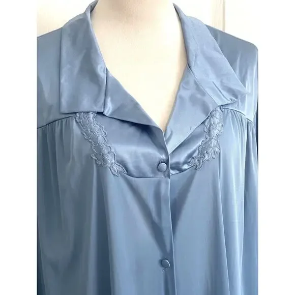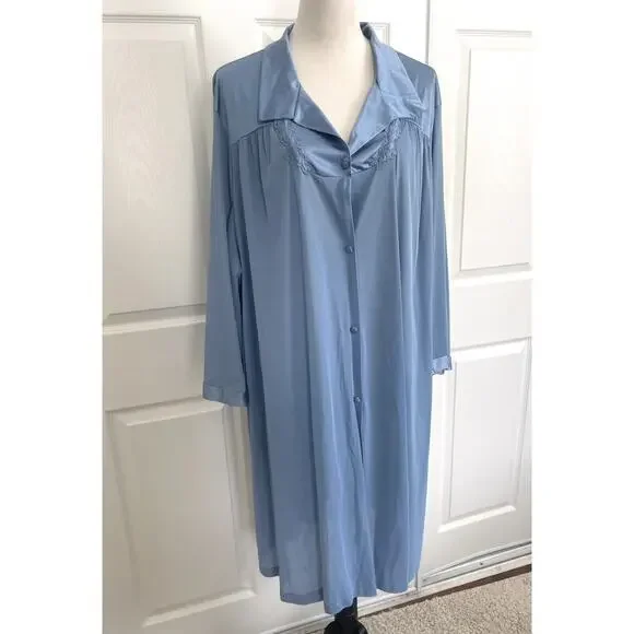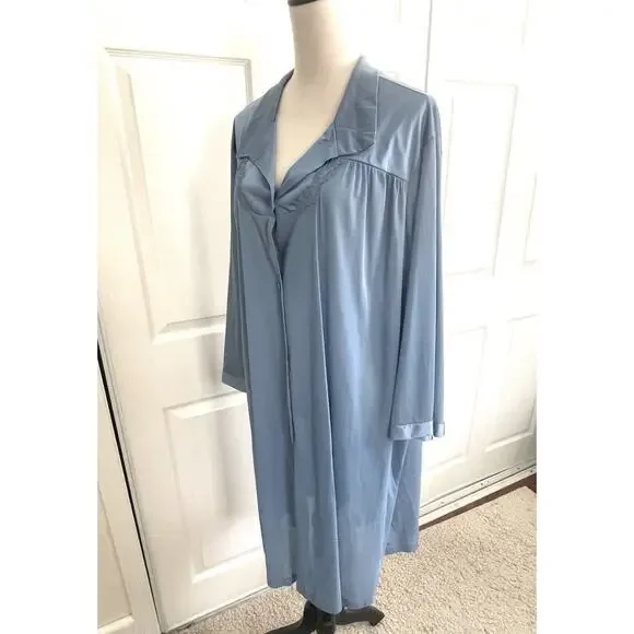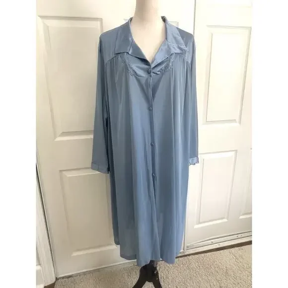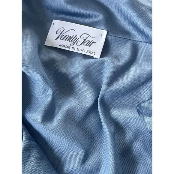 Elevate your evening attire with this vintage Vanity Fair robe, a classic piece that exudes timeless elegance. The serene blue hue complements the relaxed fit, ensuring comfort without compromising style. Fashioned from durable nylon, this plush robe is designed for those who appreciate the charm of original vintage clothing. This plus-size 3X robe features a collared neckline and buttons up the front, creating a sophisticated silhouette. Proudly made in the United States, it captures the essence of the Peignoir look, making it a delightful addition to any intimate apparel collection.Womens PLUS SIZE 3XClean, smoke free home.Excellent conditionFast shipping