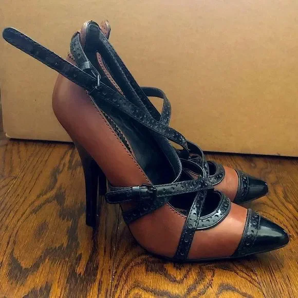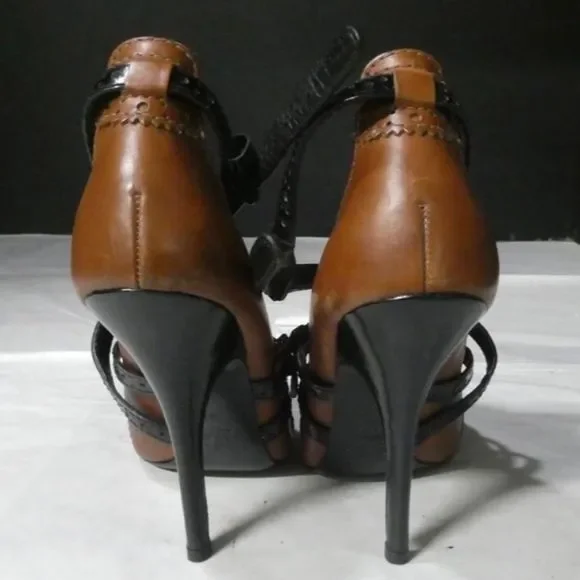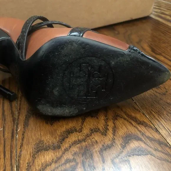 TORY BURCH Women’s Judith Honey Brown and Black Size 9M Stiletto HeelsTORY BURCH Stunning Brown Leather Heels With Black Leather Accents.Black Cap Toes and Heels, Black Brogue Banded Leather Trim and Straps Round The AnklesHeels Stand At Approximately 4-1/2” TallPreOwned and PRELOVEDAsk Questions and/or Request Additional Photos, Measurements as NeededColor May Vary Based On Shadows, Lighting, Monitor, Display Settings Retailed for Approximately $450 Open to Best Reasonable Offer