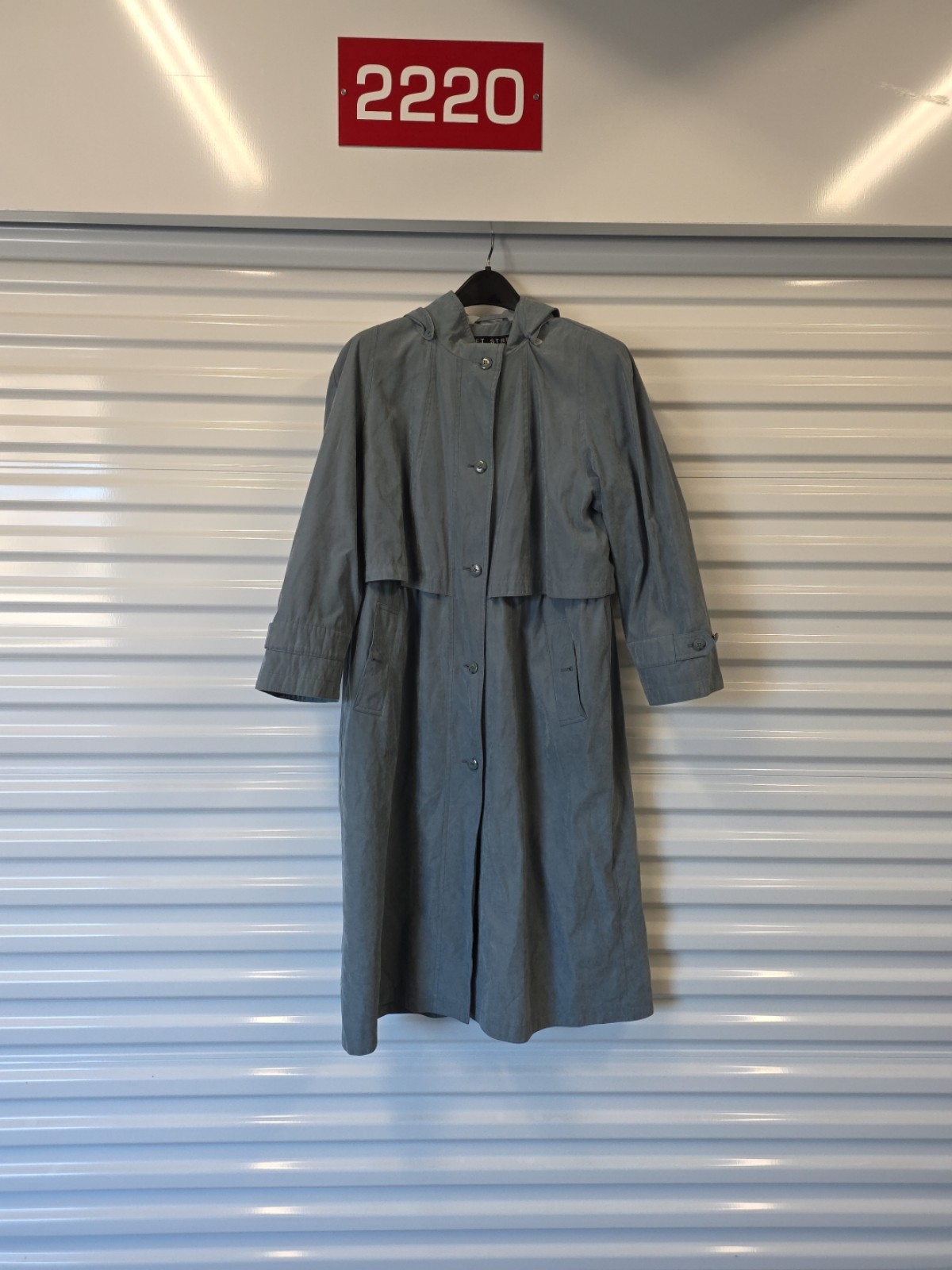 Fleet Street women’s long hooded raincoat in a light blue color. Full button-front closure, hip pockets, and rear vent. Hood is attached. Lightweight coated shell designed for rain and wind protection. Long trench-style silhouette with a petite-proportioned fit.
