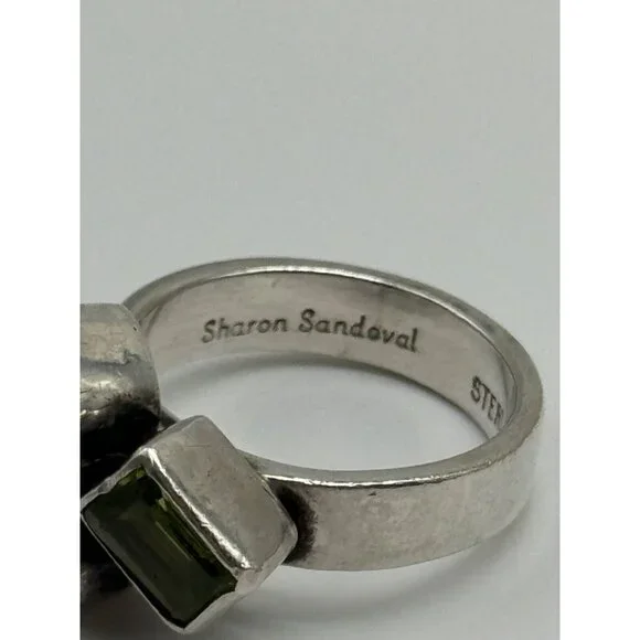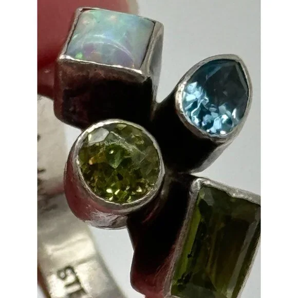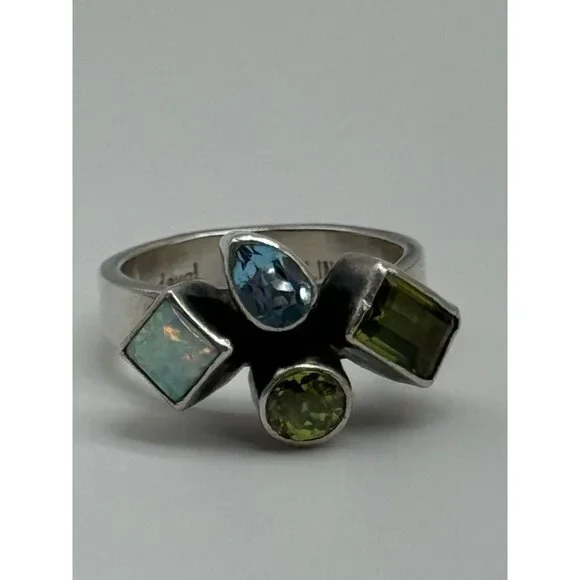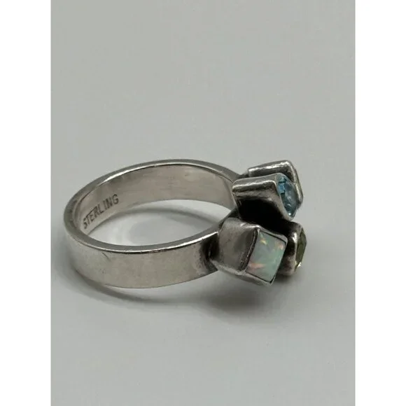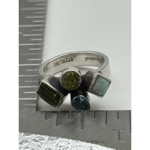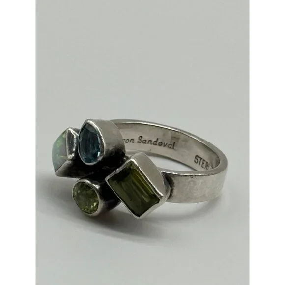 This listing is for a Sharon Sandoval San Felipe Pueblo Sterling Silver Multi Stone Lab Opal Ring.It is approximately a size 7.25.It is in very good preowned condition with use related wear, there is wear to the surface of the round green stone and there is wear to the silver.Please look closely at all photos for condition.If you have any questions, please message me.Thanks for looking at my listing!