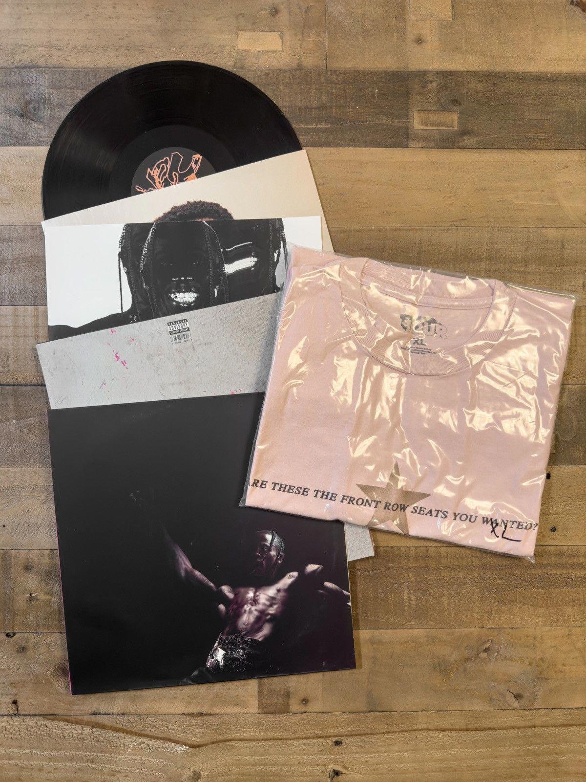 Travis Scott Utopia Circus Maximus Tour Front Row Seats Star Tee only available at the show. In Pink Size XL. Bundle includes tee and sealed Utopia Vinyl (all pieces pictured in second photo, vinyl you will receive is sealed). Tee is Thick material, nicer quality than the online tees. Star graphic on the front with bubble print text, sleeve logo, and large graphic on the back. All of my items are 100% authentic and brand new, sealed in original packaging (unless otherwise stated) - receipts can be provided for any items posted, don't hesitate to ask any questions.